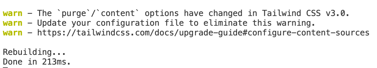 원래 Tailwind V2를 쓸 때에는 tailwind.config.js에서 purge option을 지정해야했는데 V3이 되면서 더이상 purge options을 쓰지 않도록 변경되었다.