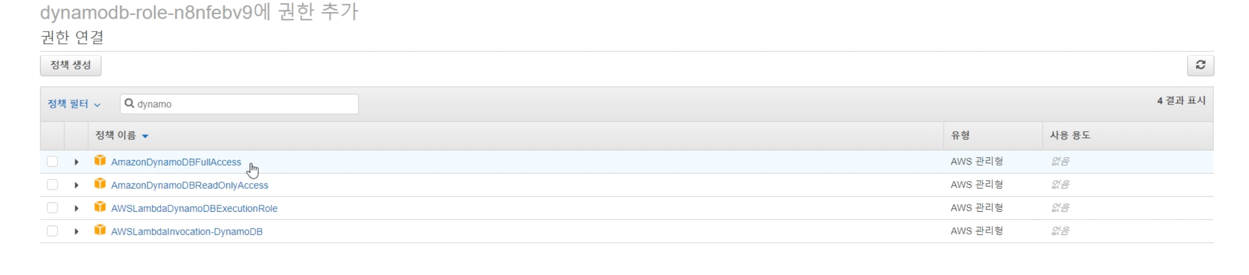 (3) Lambda >> 역할 >> 정책 생성 >> AmazonDynamoDBFullAccess