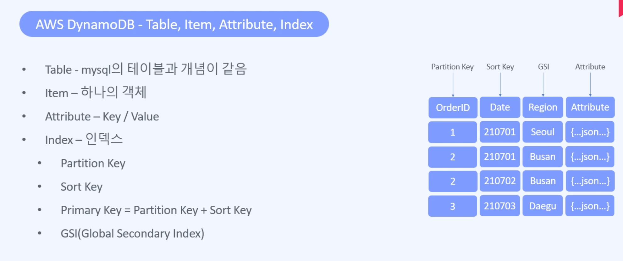- Index값은 무조건 있어야 한다! Index는 3가지 종류가 있다 (Partition Key, Sort Key, GSI)