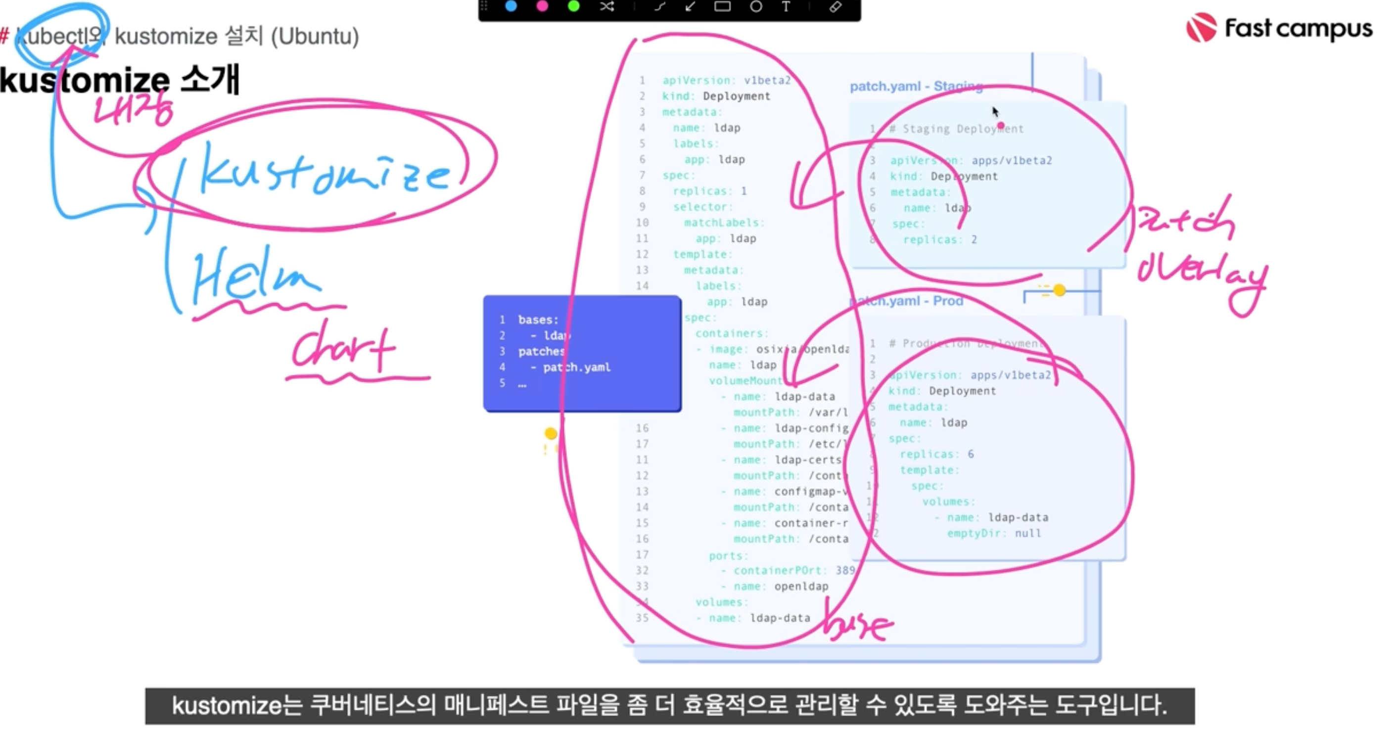Kustomize 이란 ? 쿠버테니스의 매니페스트 파일을 좀 더 효율적으로 관리할 수 있도록 도와주는 도구이다. Kubectl 안에 들어가서 내장되어 있음 (양대산맥 중에 헬름 있음)