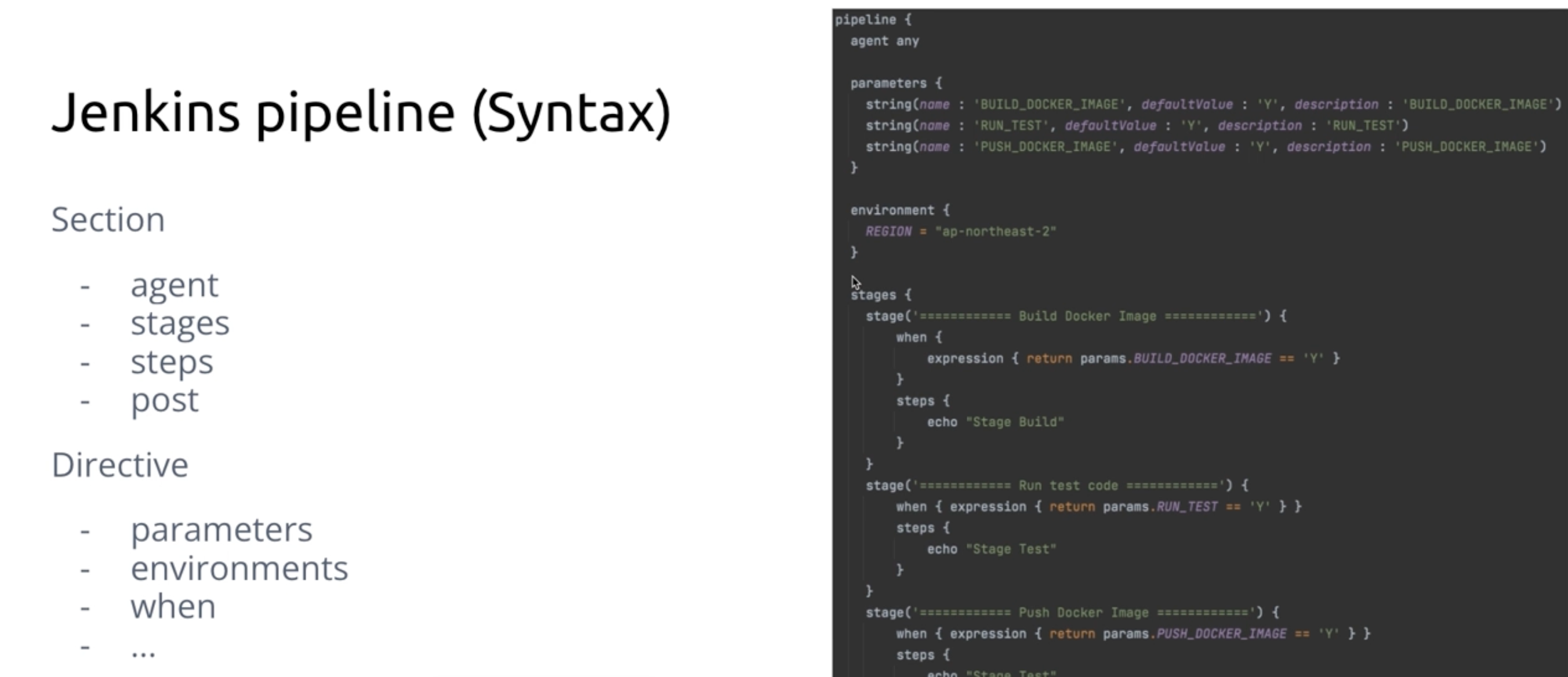 - Jenkins DSL이라는 언어를 통해서 선언적 형태의 Pipeline을 작성할 수 있다