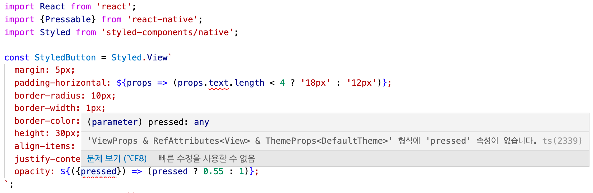 styled-component 공식문서에서 시키는대로 props에 따라서 스타일링을 다르게 하고 싶은데, 무엇인가 속성이 또 없다고 합니다. 왠지 typescript 때문인 것 같습니다.