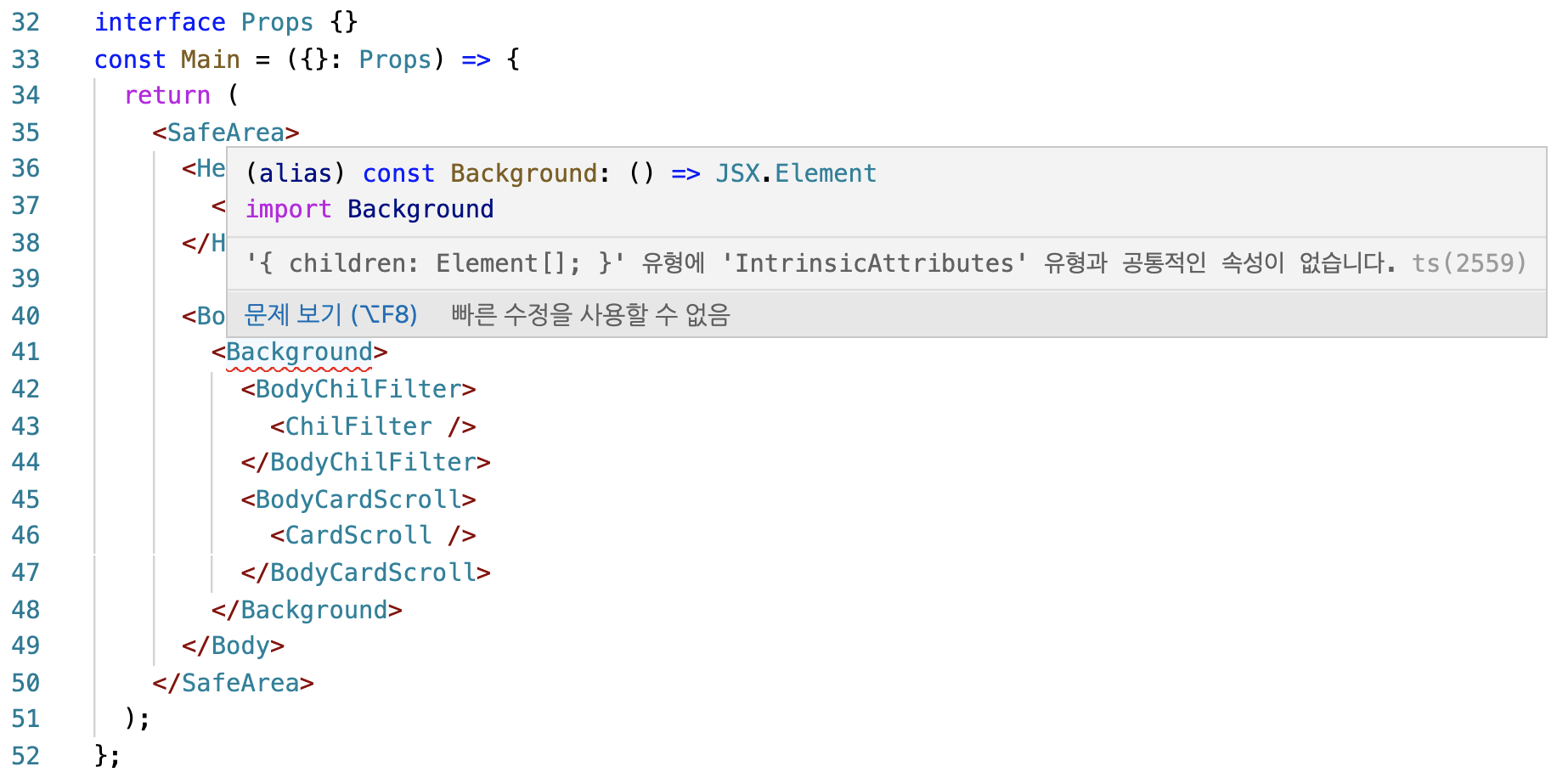 배경이미지 컴포넌트가 특정한 props를 받는 것은 아니지만 아래와 같이 props: any를 추가해주니 에러가 간편하게 해결되었다!